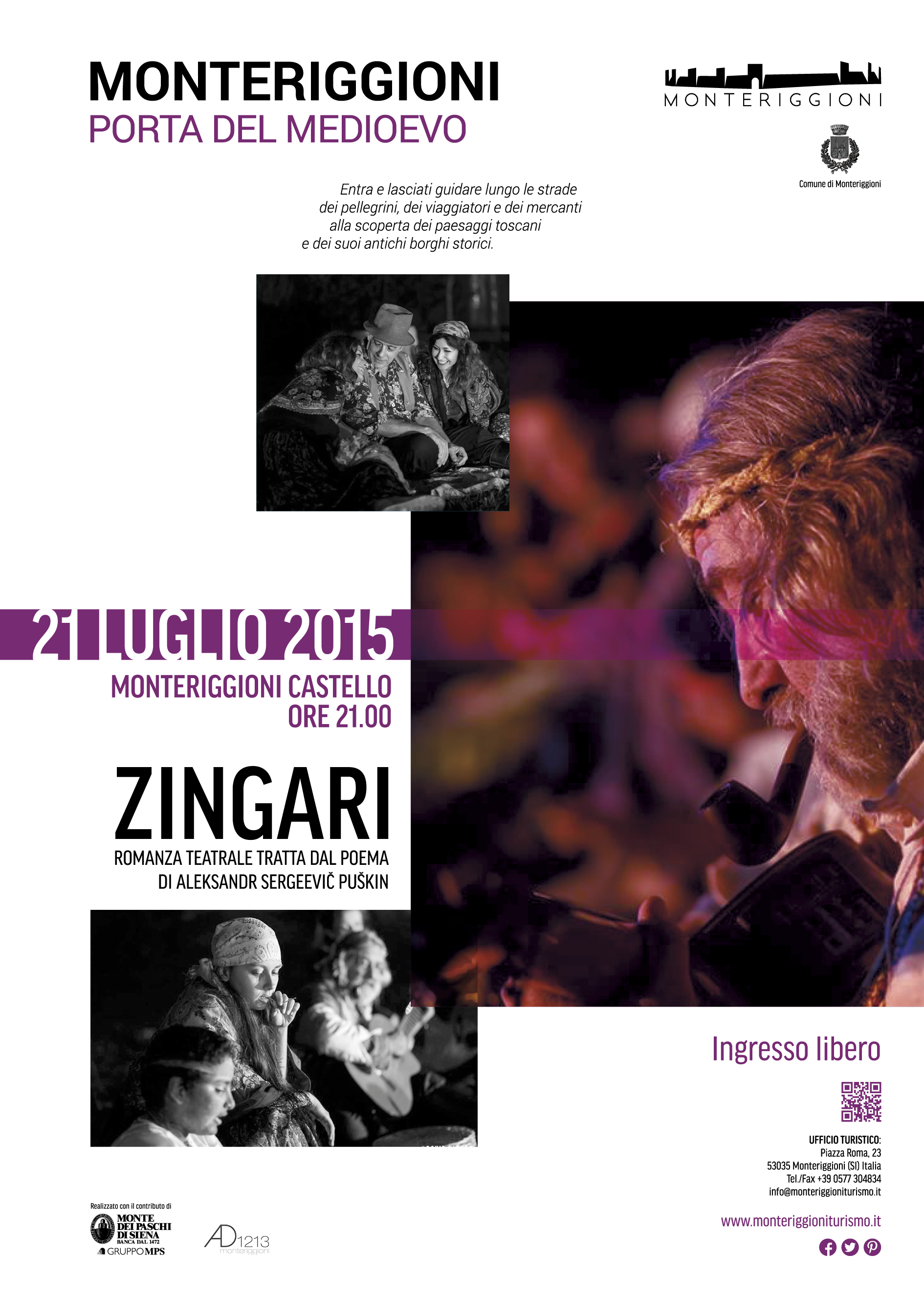 Il 21 luglio, al castello di Monteriggioni alle ore 21.00, si terrà lo spettacolo "Zingari", romanza teatrale tratta dal poema di Aleksandr Sergeevic Puskin.