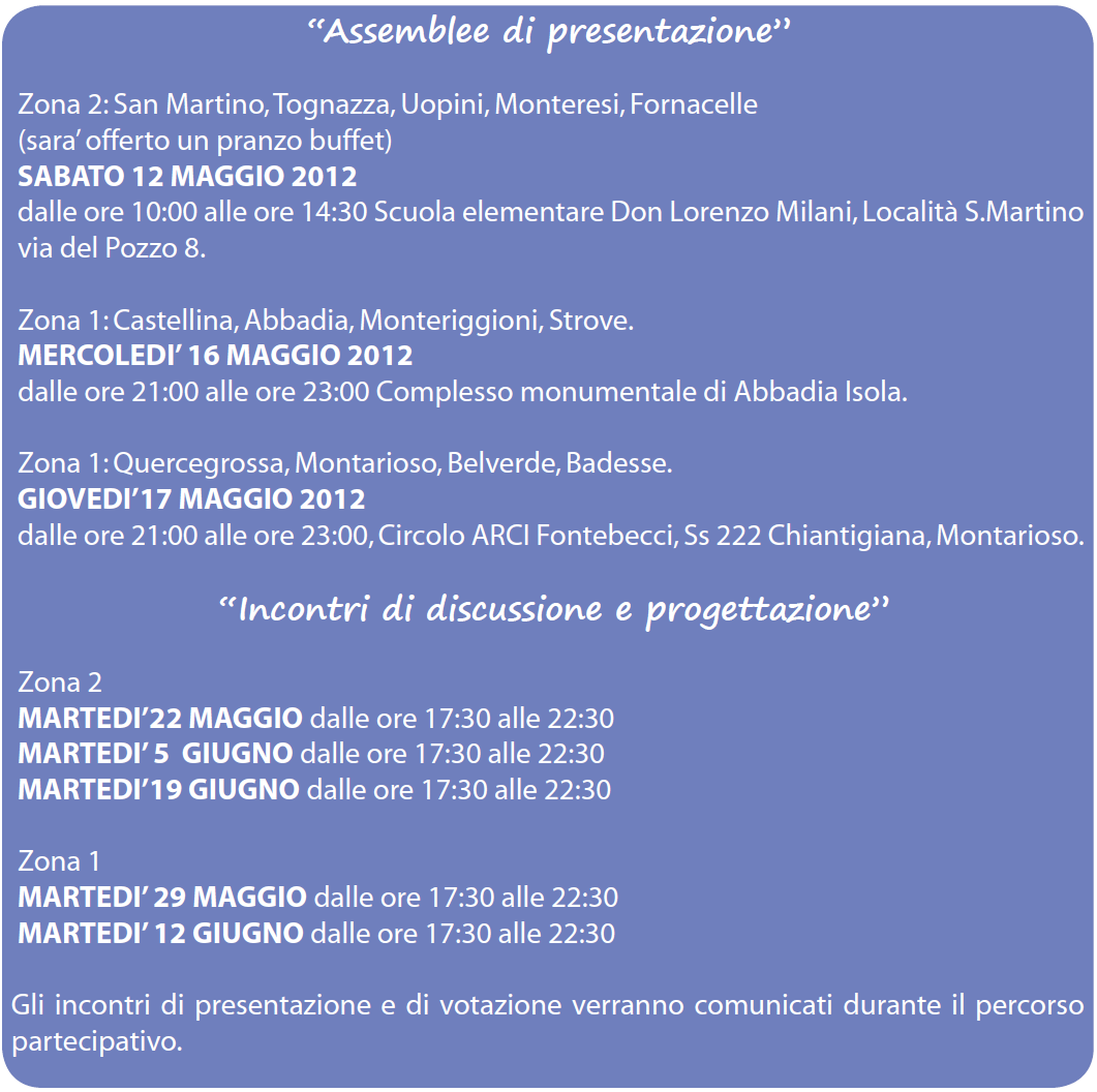 Verranno organizzate tre assemblee pubbliche di presentazione nel mese di maggio 2012, una nella Zona 2 e due nella Zona 1. Gli incontri saranno aperti a tutta la cittadinanza.