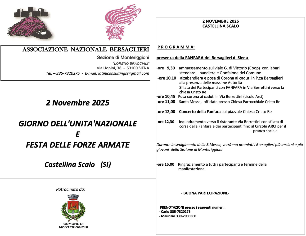 DOMENICA 2 NOVEMBRE 2025, si svolgerà la ricorrenza della Festa delle Forze Armate e Unità d’Italia a Castellina Scalo.