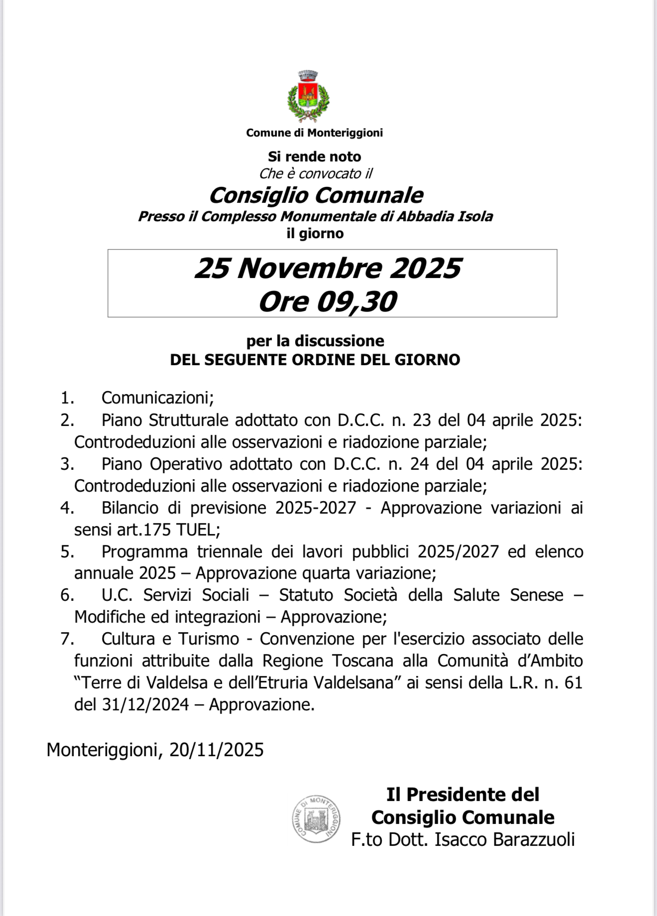 Si rende noto che è convocato il Consiglio Comunale presso il Complesso Monumentale di Abbadia Isola.