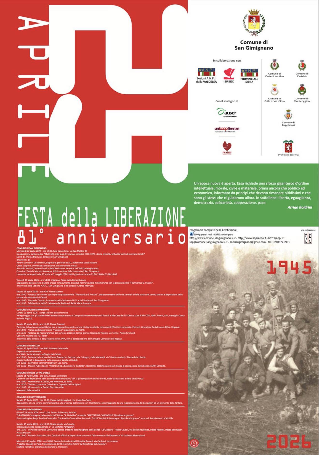 Il Sindaco Andrea Frosini, “Il 25 aprile è una memoria concreta, fatta di storie, sacrifici e scelte che hanno segnato profondamente anche le nostre comunità, come abbiamo ricordato alcune settimane fa durante le celebrazioni dell’Eccidio di Montemaggio. Non è, quindi, solamente un giorno da ricordare, ma un’occasione per dare valore, insieme, a ciò che quella stagione ci ha consegnato e che ancora oggi ci riguarda da vicino, ogni giorno”.
