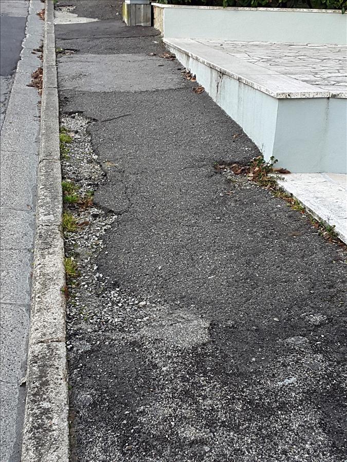 Sgretolamento bitume esistente e formazione di buche su marciapiede di Viale 2 Giugno davanti al civico n° 2 .
