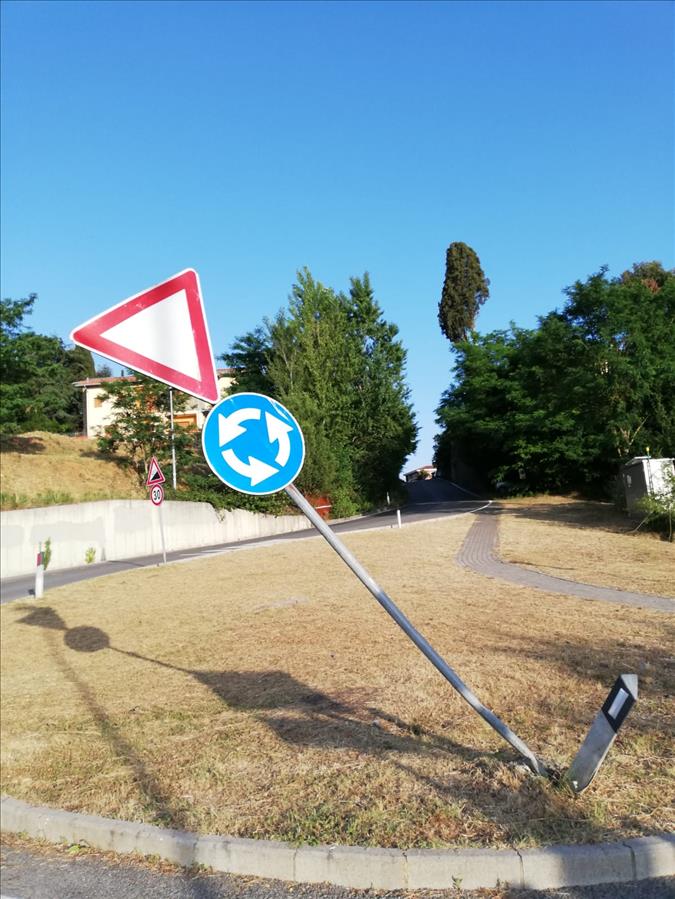 cartello pericolante lungo la strada provinciale di uopini all'altezza della rotonda di uopini