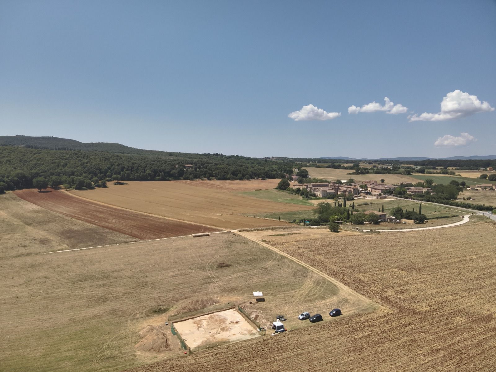 Da qualche giorno i pellegrini della Francigena vedono nel mezzo al campo a lato della strada una rete verde, quasi mimetizzata tra l’erba. Non è un miraggio prodotto dal caldo che, mescolato all’umidità, produce un effetto straniante: sono i ricercatori che stanno conducendo lo scavo nell’ambito di un accordo tra Comune di Monteriggioni, Università degli Studi dell’Aquila e Soprintendenza ABAP Siena, Grosseto e Arezzo.