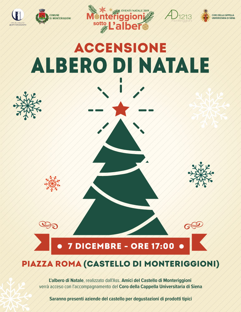 Il 7 dicembre alle ore 17.00 l'Albero di Natale realizzato dall'Ass. Amici del Castello di Monteriggioni verrà acceso in Piazza Roma con l'accompagnamento del Coro della Cappella Universitaria di Siena.