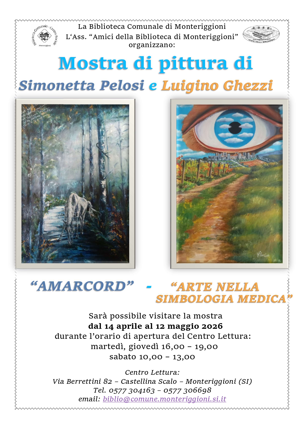 Dal 14 aprile al 12 maggio 2026 sarà possibile visitare, presso il Centro Lettura, in Via Berrettini 82 a Castellina Scalo, la mostra di pittura di Simonetta Pelosi e Luigino Ghezzi dal titolo: "Amarcord / Arte nella simbologia medica".