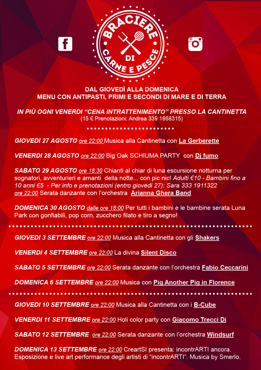 Dal 27 agosto al 13 settembre (dal giovedì alla domenica), presso gli impianti sportivi di Quercegrossa, G.S.D. Quercegrossa organizza il "Braciere di carne e pesce".