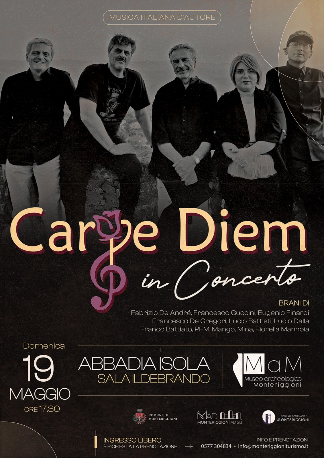 Domenica 19 maggio 2024 ore 17:30, al complesso monumentale di Abbadia Isola e MaM - Museo archeologico di Monteriggioni - Sala Ildebrando, concerto dei Carpe Diem.