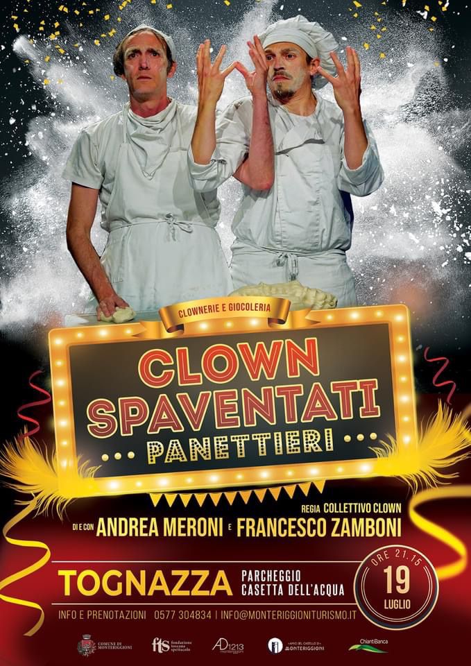 Cambiamento di location per lo spettacolo previsto per mercoledì 19 luglio, ore 21,15. Contrariamente alla programmazione originaria (prevedeva Strove), lo spettacolo per famiglie “Clown spaventati panettieri” si terrà a La Tognazza, parcheggio Casetta dell’acqua. Una serata di clownerie e giocoleria.