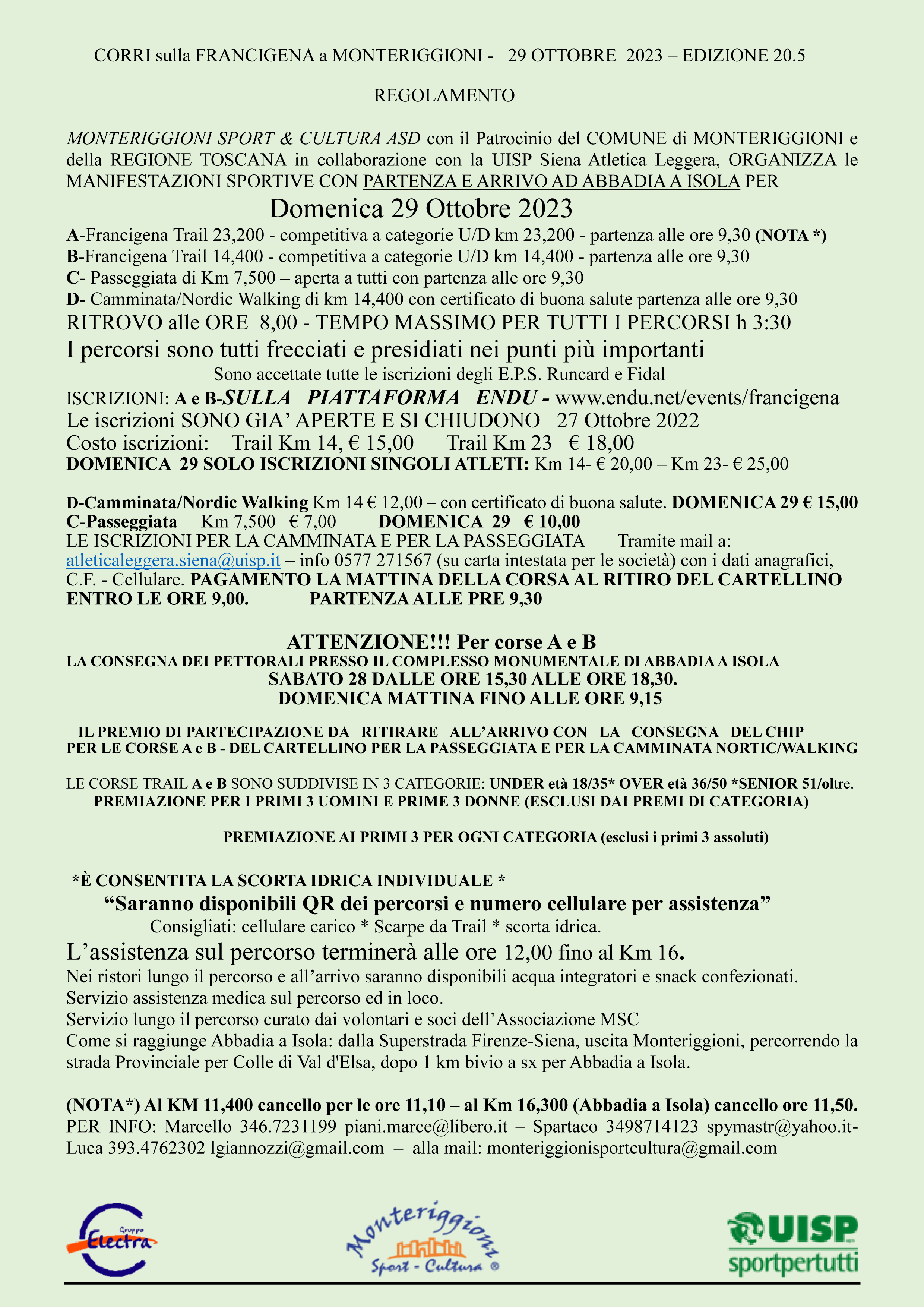 Domenica 29 Ottobre la Monteriggioni Sport e Cultura ASD organizza “Corri sulla Francigena trail a Monteriggioni - edizione 20.5”. Partenza e arrivo da Abbadia Isola (Monteriggioni – SI).