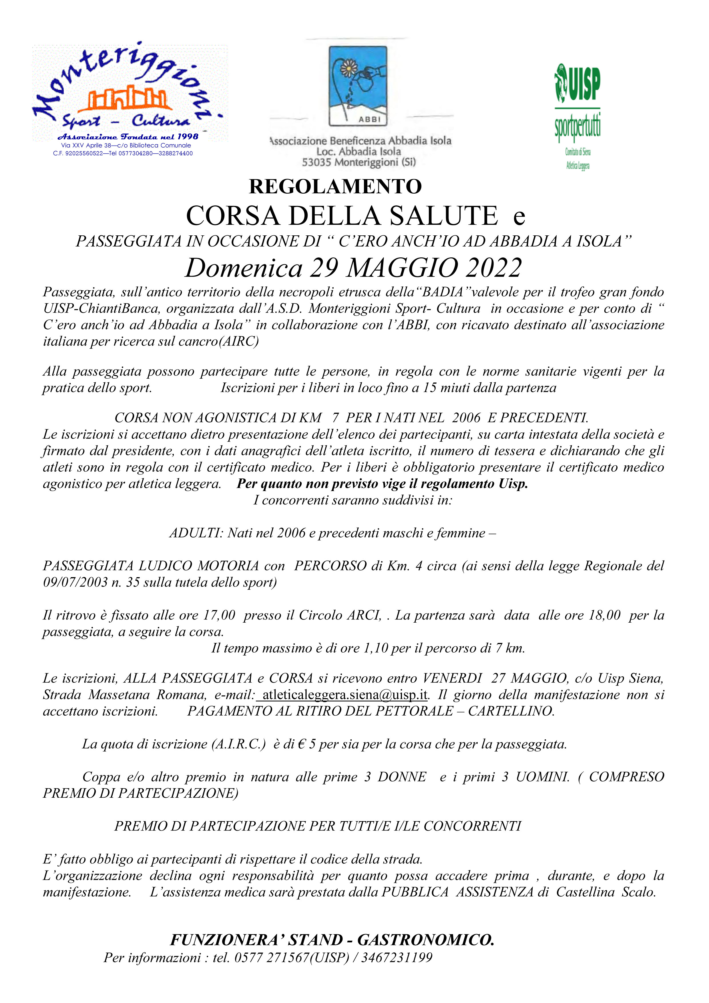 Il 29 maggio si terrà una passeggiata sull'antico territorio della necropoli etrusca della "Badia" valevole per il trofeo UISP-ChiantiBanca organizzata dall'ASD Monteriggioni Sport-Cultura in occasione di "C'ero anch'io ad Abbadia a Isola" in collaborazione con l'ABBI, con ricavato destinato all'associazione italiana per la ricerca sul cancro (AIRC).
