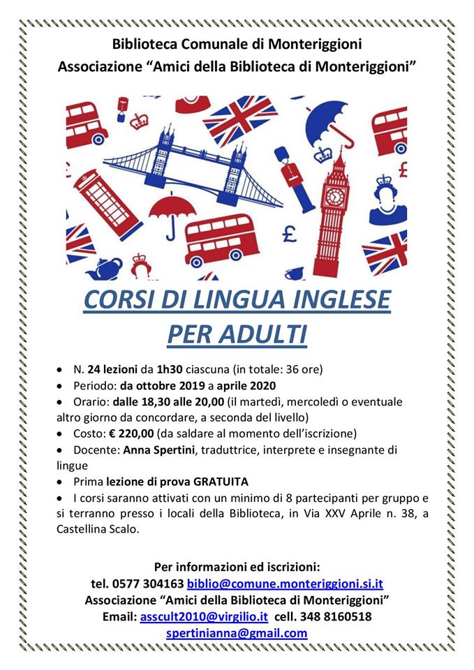 Da Ottobre ad Aprile, presso la Biblioteca Comunale di Castellina Scalo, si svolgerà un corso di inglese per adulti con l’insegnante Anna Spertini.