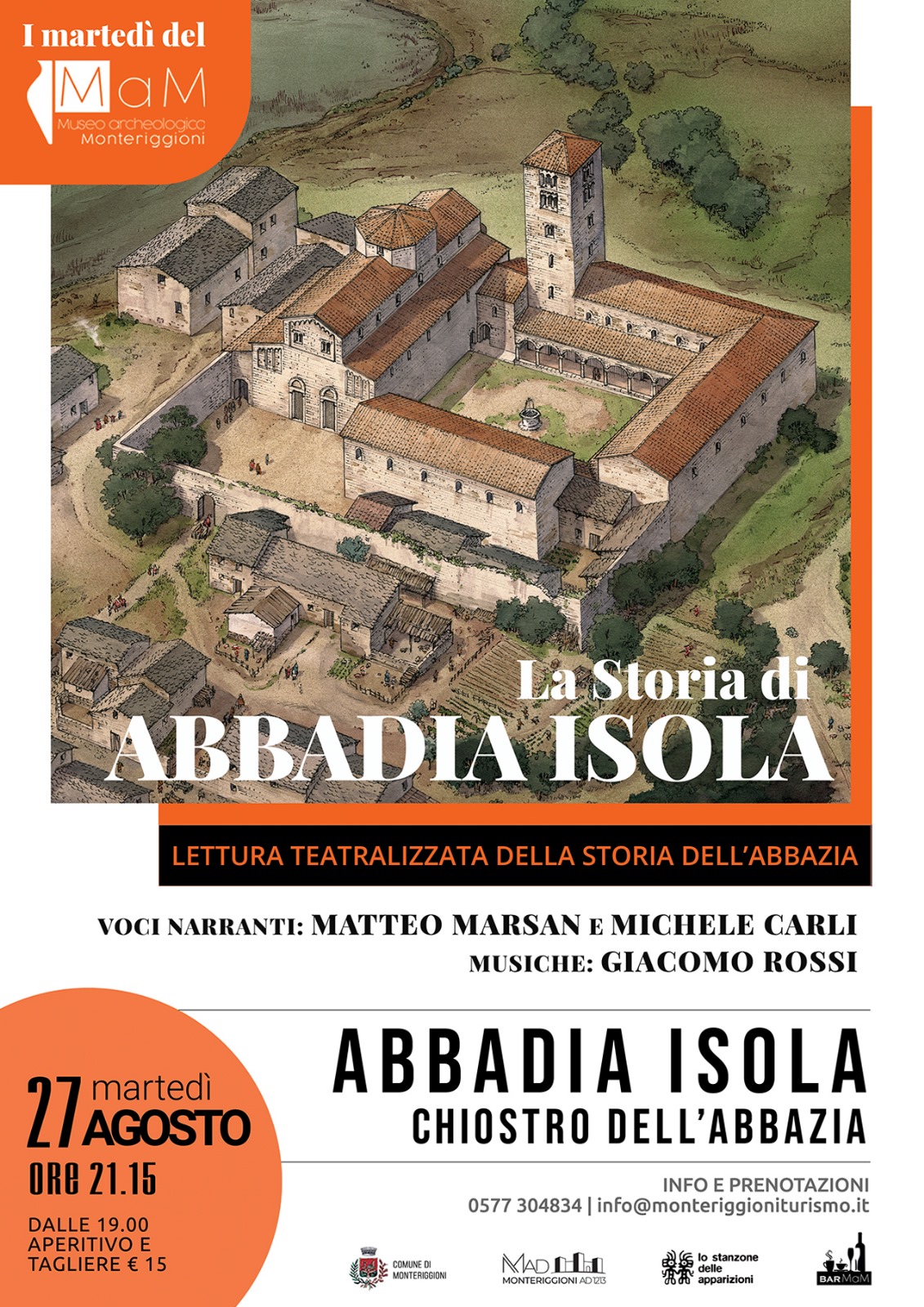 Martedì 27 agosto, ore 21:15, per i "Martedì del MaM", chiostro di Abbadia Isola, “La Storia di Abbadia Isola”, lettura teatralizzata della storia dell’Abbazia, con Matteo Marsan e Michele Carli, musiche Giacomo Rossi.