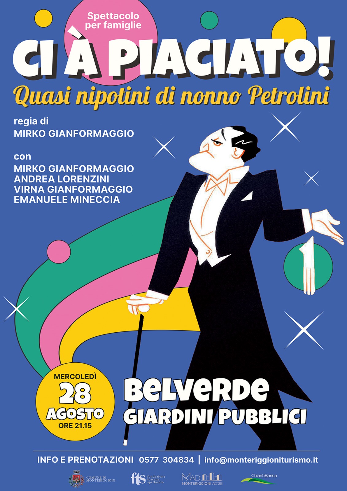 Mercoledì 28 agosto, ore 21:15, a Belverde nei Giardini Pubblici, lo spettacolo per famiglie “Ci à piaciato tanto. Quasi nipoti di nonno Petrolini” con Mirko Gianformaggio, Andrea Lorenzini, Virna Gianformaggio, Emanuele Mineccia.