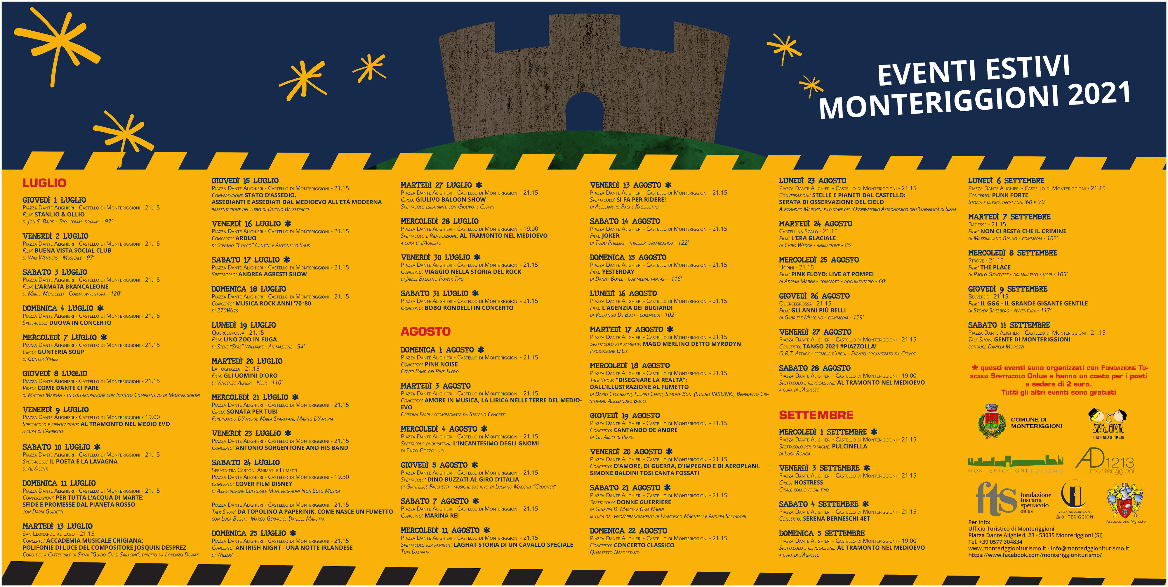 Il cartellone è curato dal Comune di Monteriggioni, da Fondazione Toscana Spettacolo, dalla società Monteriggioni AD 1213, dall'Associazione Amici del Castello e vedrà la collaborazione dell’associazione culturale “L’Agresto”.