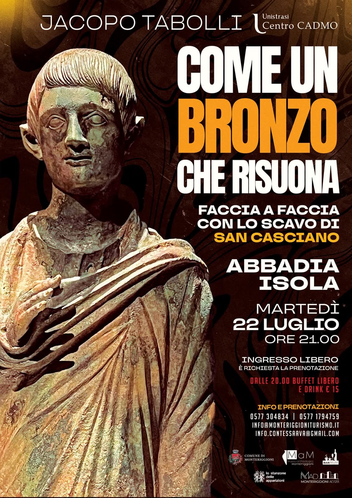 Martedì 22 luglio – ore 21.00 – Abbadia Isola: “Come un bronzo che risuona. Faccia a faccia con lo scavo di San Casciano dei Bagni”. I “Martedì di Abbadia” si aprono con un nome di primo piano nel panorama archeologico italiano e internazionale: Jacopo Tabolli, professore di Archeologia presso l’Università per Stranieri di Siena e coordinatore scientifico del celebre scavo di San Casciano dei Bagni. La serata accompagnerà il pubblico dentro uno dei ritrovamenti più sensazionali degli ultimi decenni. Un’occasione per riflettere sul significato del patrimonio culturale e sull’emozione dello scavo archeologico come “incontro” con le voci del passato.