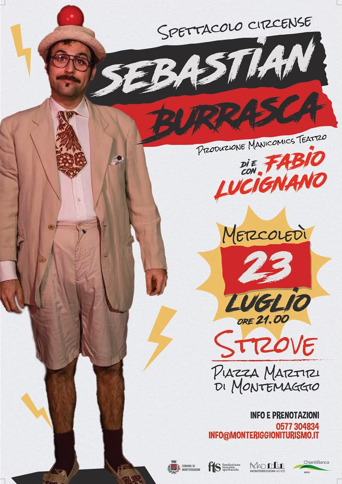 Mercoledì 23 luglio – ore 21.00 – Strove, “SEBASTIAN BURRASCA” di e con Fabio Lucignano Produzione: Manicomics Teatro; nella suggestiva cornice del borgo, va in scena uno spettacolo per tutta la famiglia. Sebastian Burrasca è un clown, un sognatore, un funambolo dell’anima. Con il suo carretto di oggetti improbabili e una comicità lieve e poetica, Fabio Lucignano – attore e autore – trasporta il pubblico in un viaggio tra acrobazie, gag e risate intelligenti. Una produzione di Manicomics Teatro, compagnia emiliana che da oltre trent’anni si distingue per il teatro fisico e il circo contemporaneo.