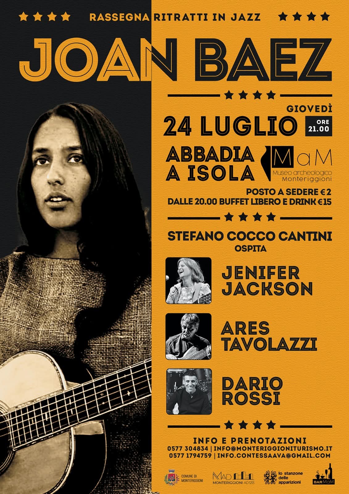 Giovedì 24 luglio – ore 21.00 – Abbadia Isola, serata dedicata a “JOAN BAEZ”. Dopo lo straordinario concerto di Gilda Buttà dello scorso giovedì, torna la magia della Rassegna Jazz ad Abbadia Isola, curata con passione e raffinatezza da Stefano “Cocco” Cantini, musicista e direttore artistico di riferimento per il panorama jazz italiano ed europeo. In questo terzo appuntamento, Cantini ospita una formazione d'eccezione guidata dalla vocalist Jennifer Jackson, interprete intensa e raffinata, la cui voce rievoca atmosfere sospese tra folk americano e jazz di matrice contemporanea; con lei sul palco un gigante della scena musicale: Ares Tavolazzi (storico contrabbassista degli Area e collaboratore di Lucio Dalla, Paolo Conte e Mina) e Dario Rossi, giovane batterista tra i più richiesti e versatili della scena jazzistica nazionale. Un concerto-omaggio all’eredità poetica e civile di Joan Baez, reinterpretata in chiave intima e visionaria.