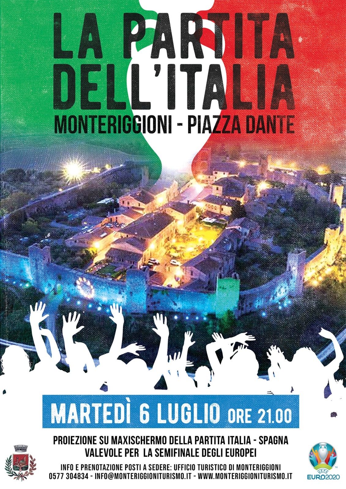 Nell’ambito degli eventi estivi promossi dal Comune di Monteriggioni, domenica 11 luglio alle ore 21 in P.za D. Alighieri (Castello di Monteriggioni) è in programma la proiezione su grande schermo della Finale degli Europei di calcio.