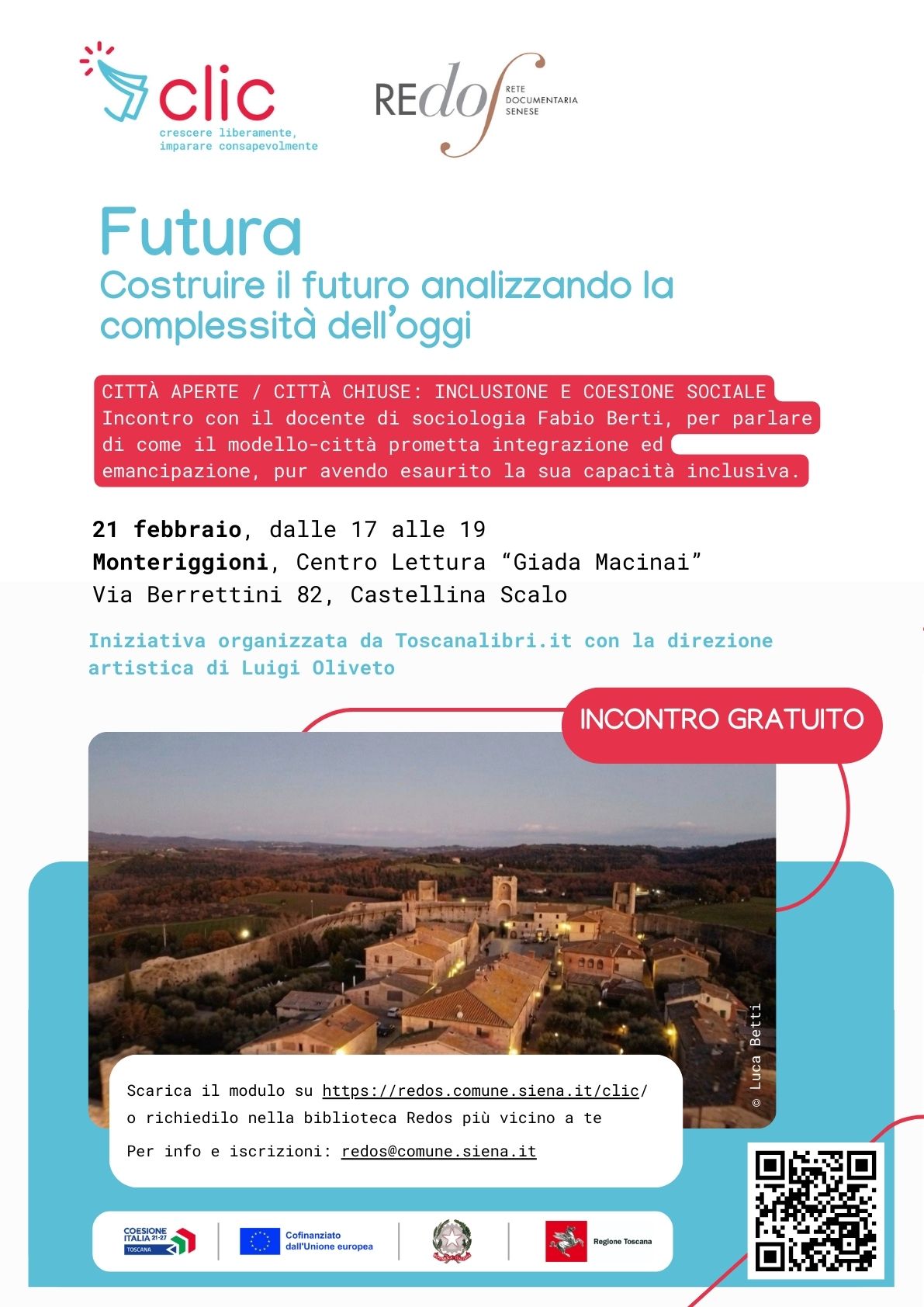 Nell’ambito del progetto CLIC (Crescere Liberamente, Imparare Consapevolmente) della rete Redos delle Biblioteche Senesi, vengono organizzate delle conferenze sui temi del futuro.