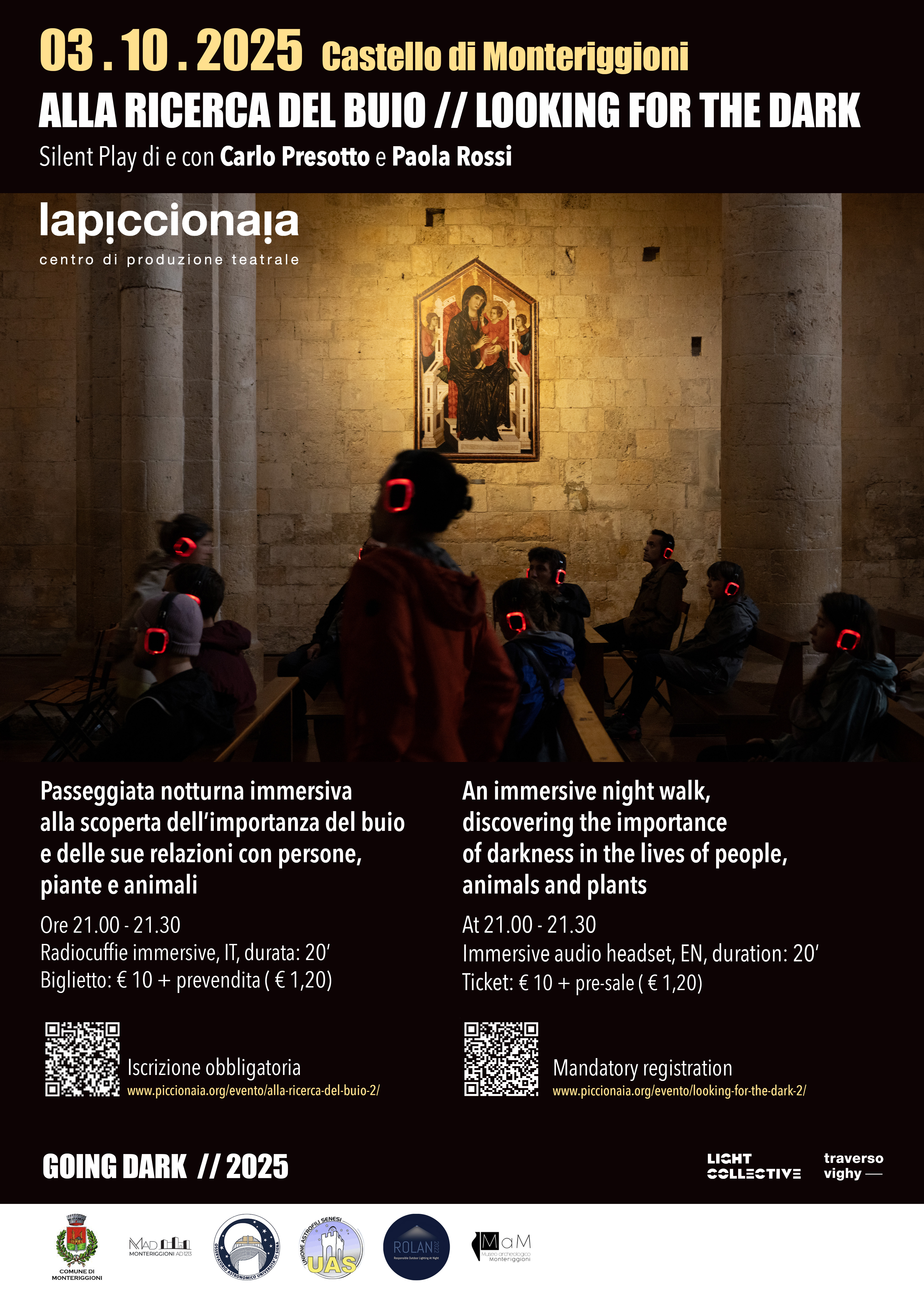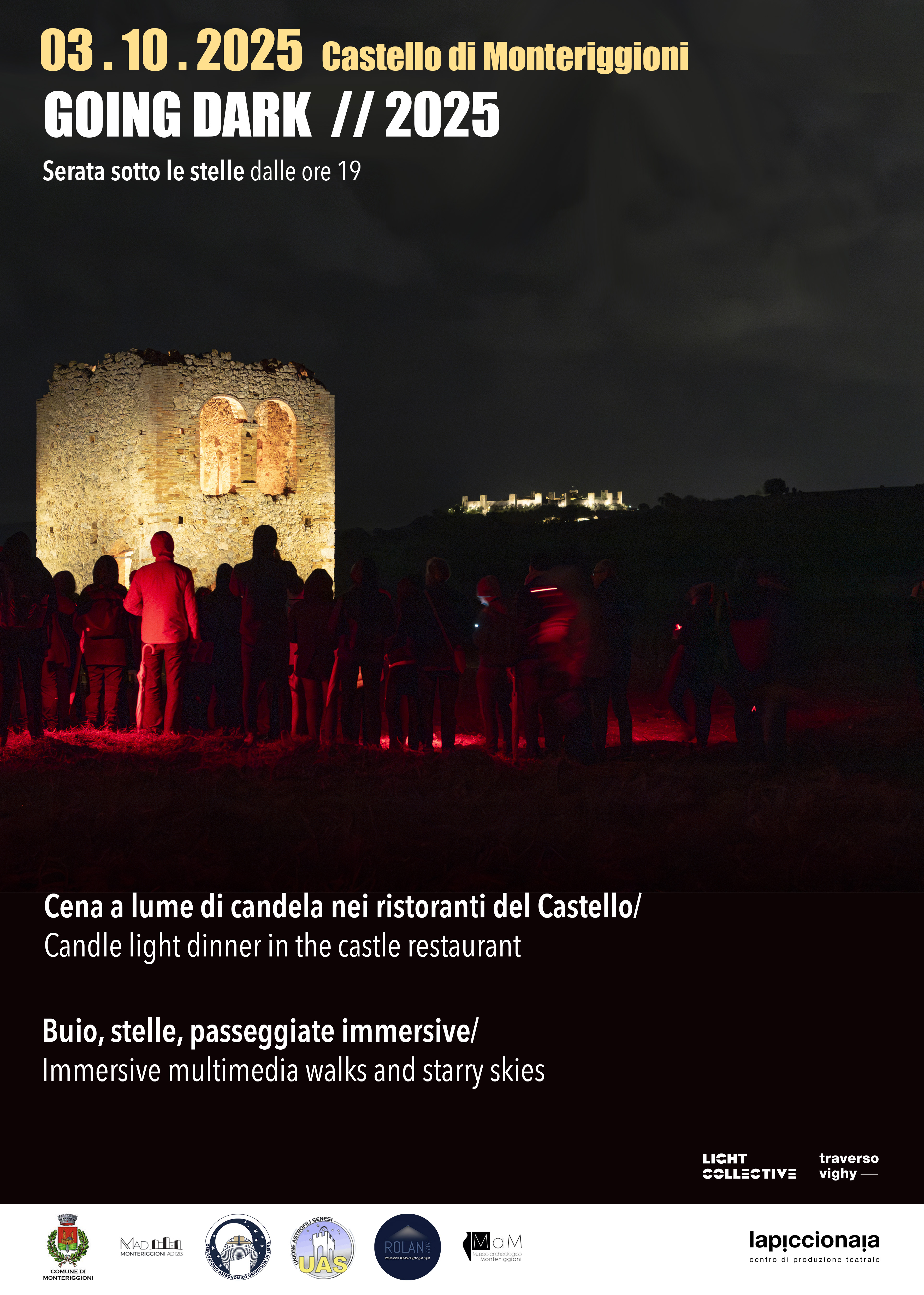 Nell’ambito della terza edizione di Going Dark, workshop dedicato alla corretta progettazione della luce negli spazi storici e alla sensibilizzazione sull’inquinamento luminoso, venerdì 3 ottobre 2025 il castello di Monteriggioni ospiterà due iniziative aperte al pubblico.
