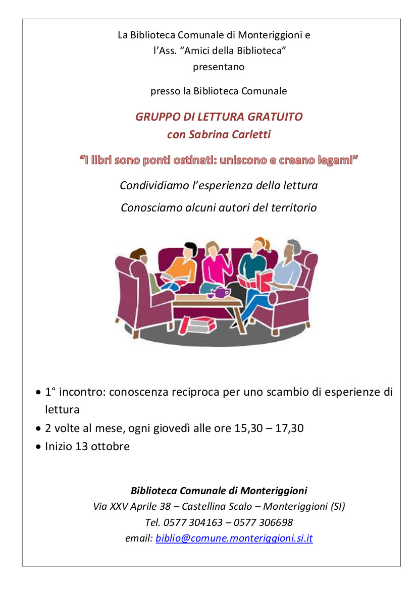 A partire dal 13 Ottobre, presso la Biblioteca Comunale di Castellina Scalo, verrà attivato un gruppo di lettura gratuito, a cura di Sabrina Carletti.