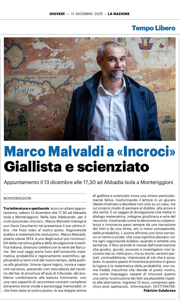 Il testo presenta l'evento del Sabato 13 Dicembre ore 17:30 ad Abbadia isola (Monteriggioni), presso la Sala Ildebrando, inserito nel ciclo autunnale «Incroci». L'ospite principale è Marco Malvaldi, autore di gialli e divulgatore scientifico, che dialogherà con Dario Ceccherini sul suo libro «Se fossi stato al vostro posto. Ragionevole dubbio e matematiche risoluzioni».