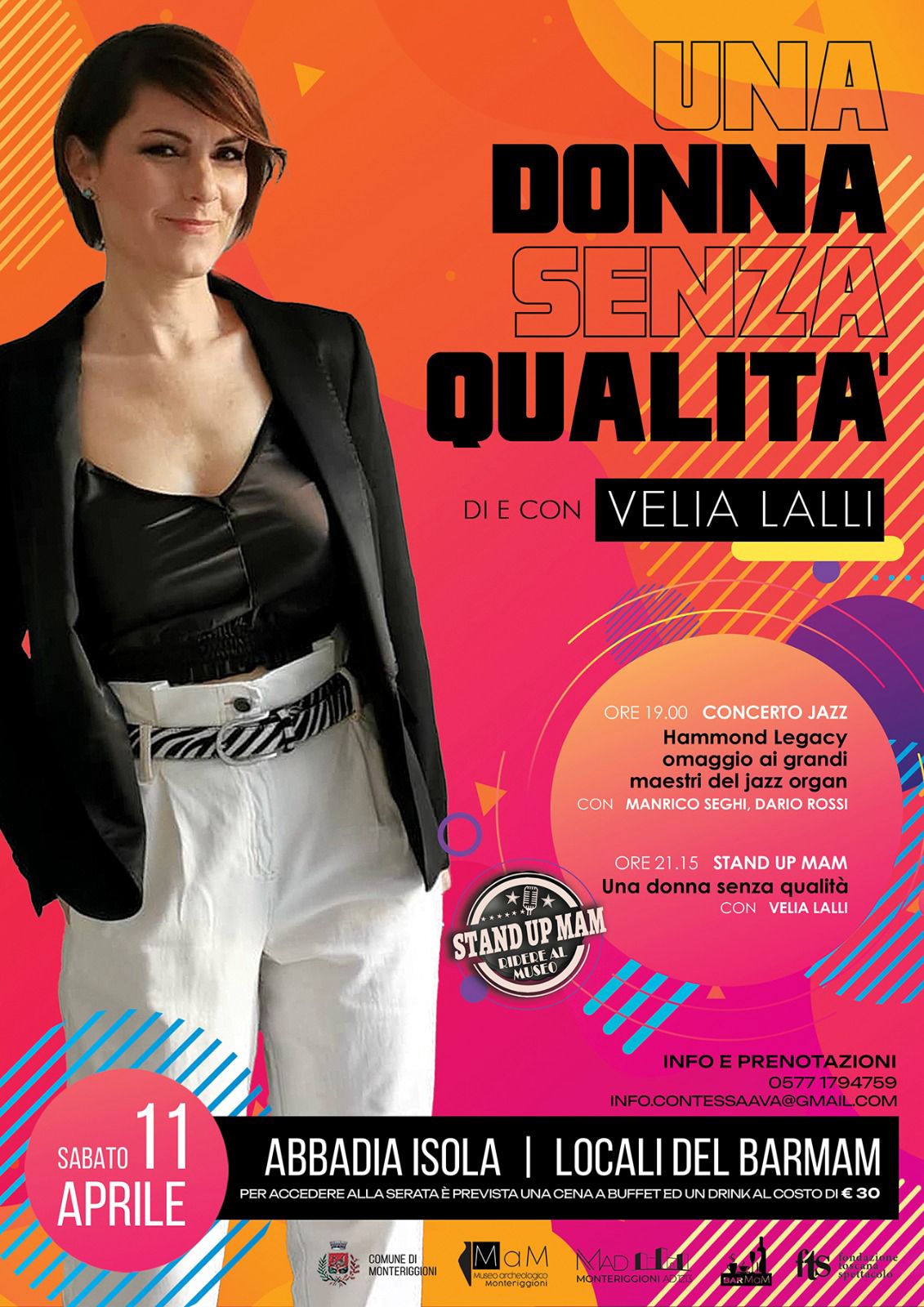 Dopo il viaggio musicale, la serata cambia ritmo ma non smette di stupire; alle 21.00 entra in scena Velia Lalli, attrice, autrice e tra le voci più riconoscibili e brillanti della stand-up comedy italiana, con “Una donna senza qualità”, spettacolo che unisce bilancio esistenziale, satira e autobiografia in un racconto feroce, intelligente e profondamente contemporaneo.