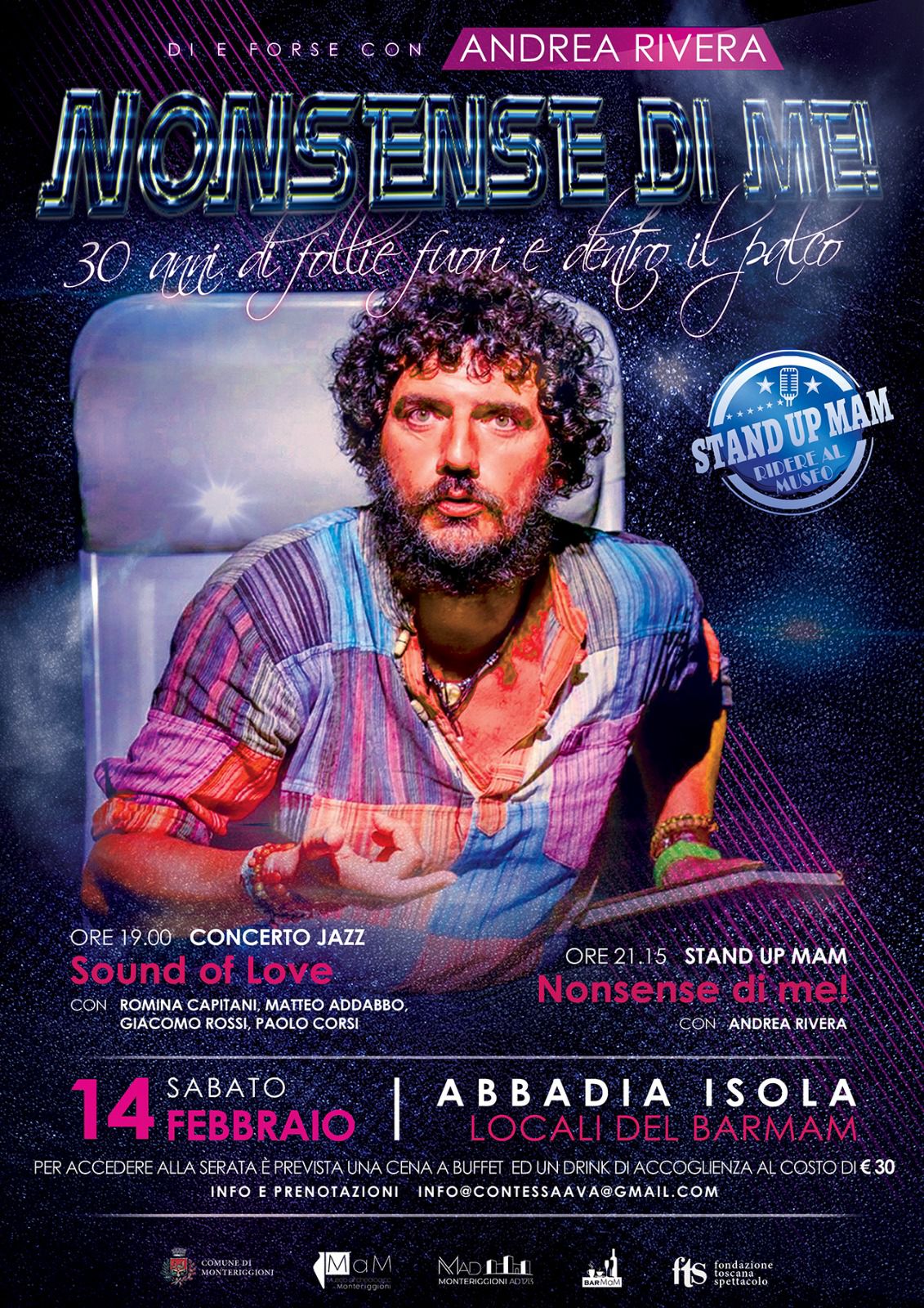 Dalle 21.15 spazio alla Stand Up Comedy con “Nonsense di me!” 30 anni di follie fuori e dentro il palco con Andrea Rivera. spettacolo di Teatro‑Canzone che attraversa vent’anni di carriera tra palcoscenico, strada, tv e cinema, in un equilibrio dichiarato di follia “sana” e autoironia.