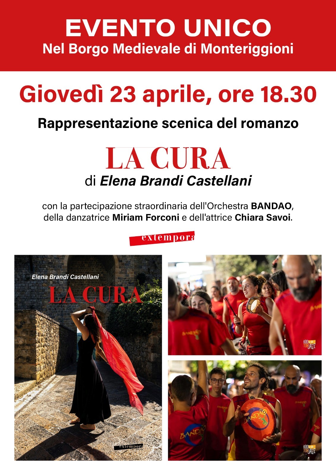 Giovedì 23 aprile 2026, alle 18,30 presso i giardini della chiesa di S. Maria Assunta a Monteriggioni (SI) si terrà “La cura”, rappresentazione scenica dell’omonimo romanzo di Elena Brandi Castellani.