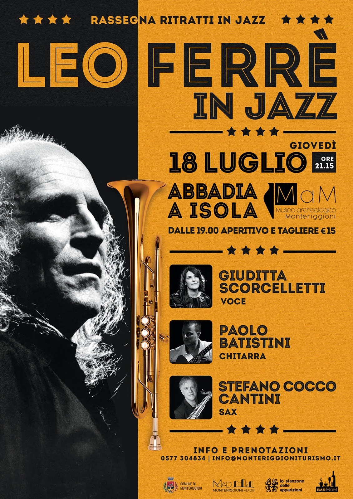 Rassegna "Ritratti in Jazz": 18 luglio "Leo Ferrè in jazz" nel Chiostro di Abbadia Isola - dalle 19 aperitivo e tagliere a Euro 15.
