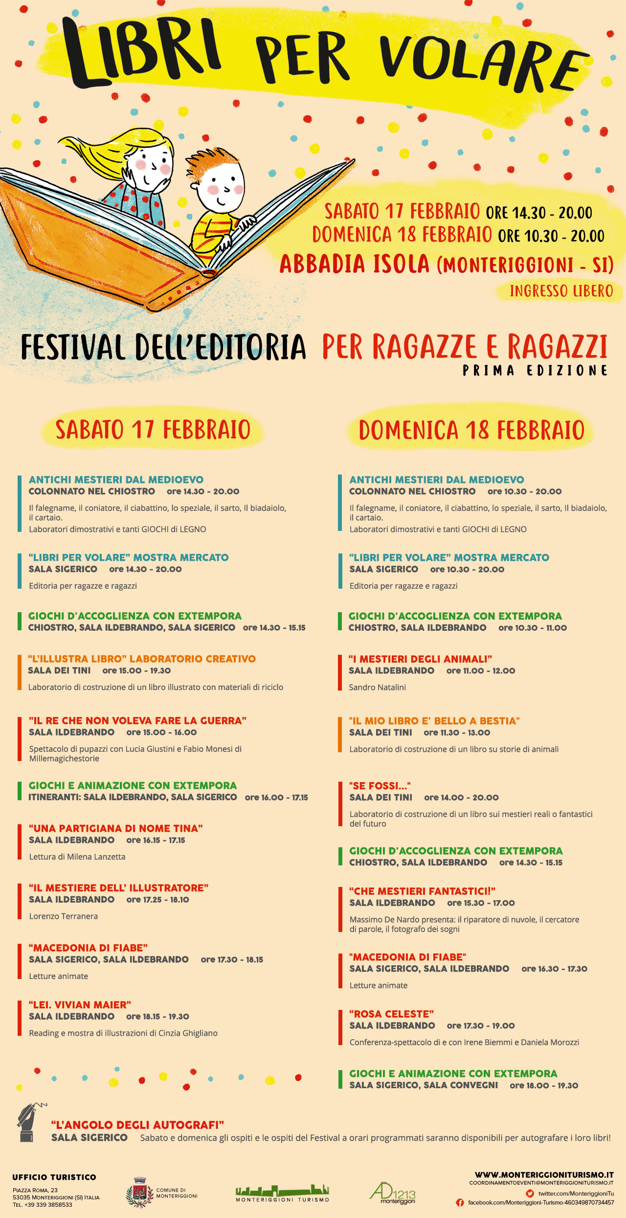 Nei giorni 17 e 18 Febbraio 2018, presso il Complesso monumentale di Abbadia Isola (Monteriggioni-SI), si svolgerà la prima edizione di “Libri per volare-Festival dell’editoria per ragazzi e ragazze".