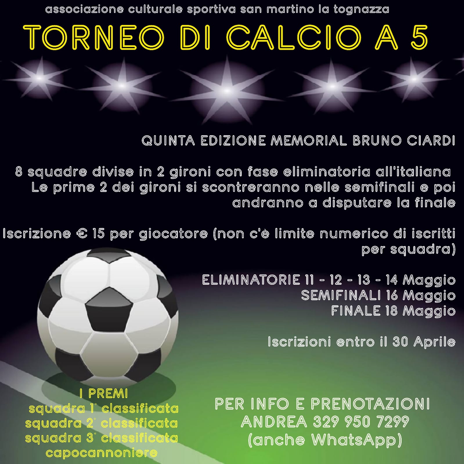 Dall’11 al 18 maggio l’associazione culturale sportiva San Martino-La Tognazza organizza la 5° edizione del Memorial Bruno Ciardi, torneo calcio a 5.