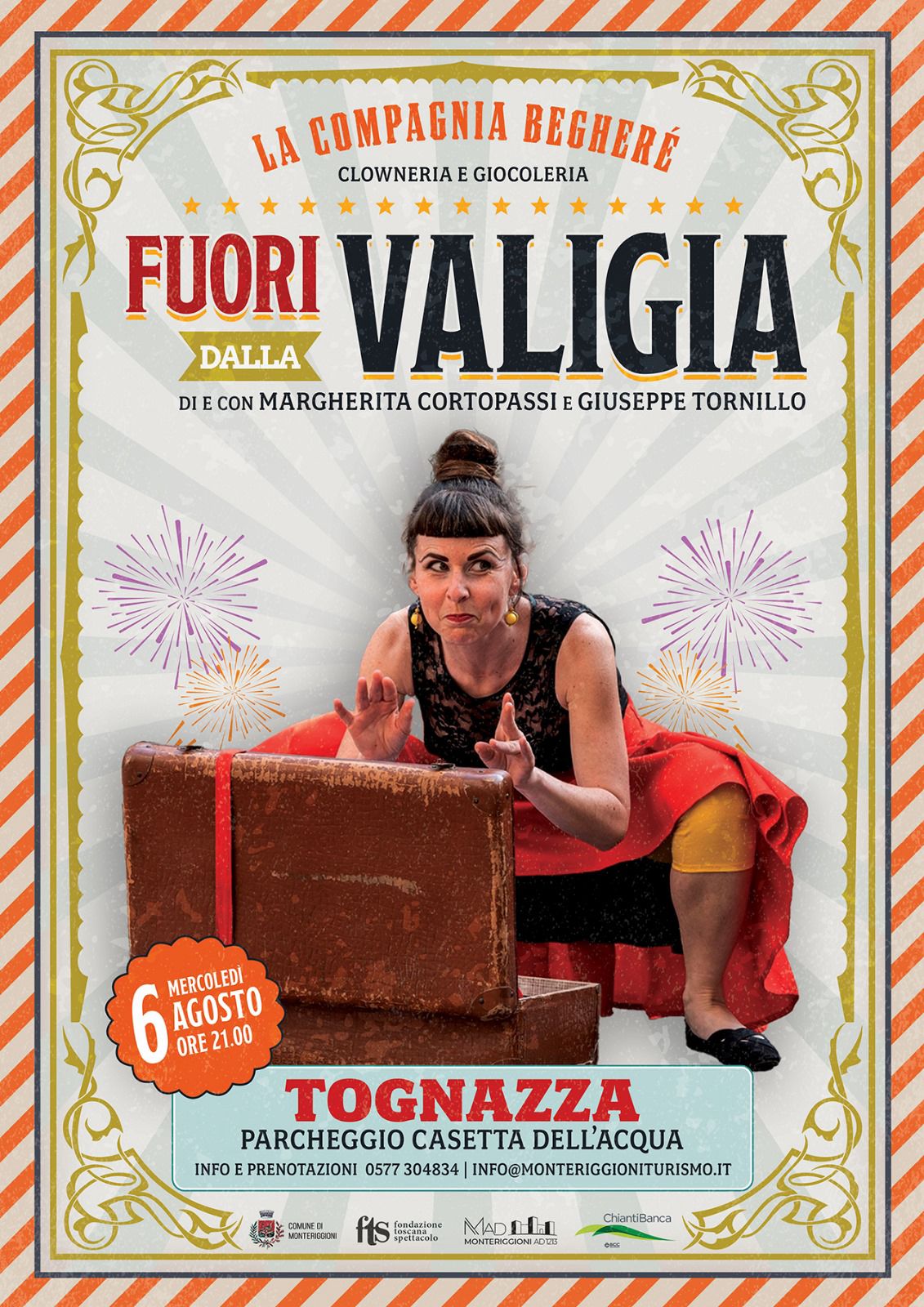 Mercoledì 6 agosto, alle ore 21:00, la rassegna fa tappa in un contesto più informale e dedicato alle famiglie, con lo spettacolo teatrale “Fuori dalla valigia” della Compagnia Begheré, interpretato da Margherita Cortopassi e Giuseppe Tornillo. L’appuntamento si terrà a La Tognazza, presso il parcheggio della Casetta dell’Acqua, e promette un’esperienza teatrale divertente e partecipativa per grandi e piccoli.