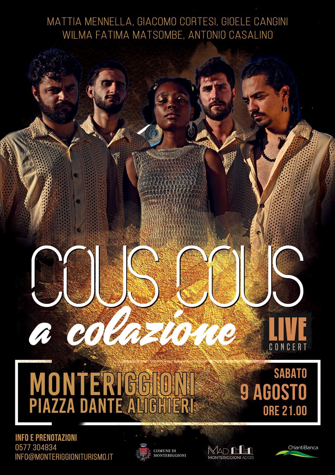 Sabato 9 agosto, alle ore 21:00, nella scenografica Piazza Dante Alighieri all’interno del Castello di Monteriggioni, chiusura in grande stile con il concerto della band Cous Cous a Colazione, un progetto musicale che mescola sonorità dance, pop ed elettroniche con influenze jazz e R&B. Fondata nel 2020 dall’incontro tra la cantante mozambicana Wilma Fatima Matsombe e il produttore Mattia Mennella, la band ha conquistato la scena indipendente italiana con uno stile world unico e coinvolgente. I loro testi pop, l’uso sapiente dell’elettronica e una fortissima presenza scenica hanno portato il gruppo a numerosi riconoscimenti, tra cui la vittoria del bando Encoder 2023.