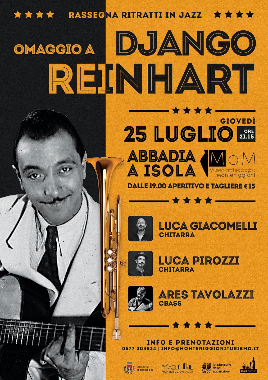 Giovedì 25 luglio alle ore 21:15 ad Abbadia Isola prosegue la rassegna “Ritratti in Jazz” (curata da Stefano Cocco Cantini, in collaborazione con Ares Tavolazzi e Lo Stanzone delle Apparizioni) con “Omaggio a Django Reinhardt”.
