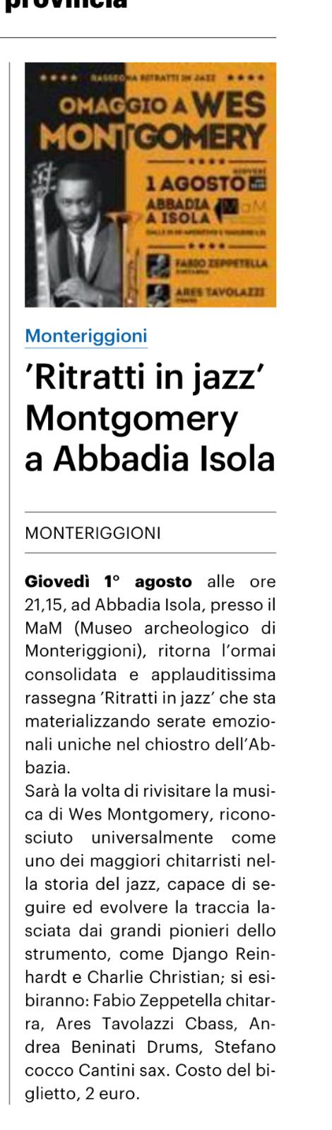 Sarà la volta di rivisitare la musica di Wes Montgomery, riconosciuto universalmente come uno dei maggiori chitarristi nella storia del jazz, capace di seguire ed evolvere la traccia lasciata dai grandi pionieri dello strumento, come Django Reinhardt e Charlie Christian; si esibiranno: Fabio Zeppetella chitarra, Ares Tavolazzi Cbass, Andrea Beninati Drums, Stefano cocco Cantini sax.