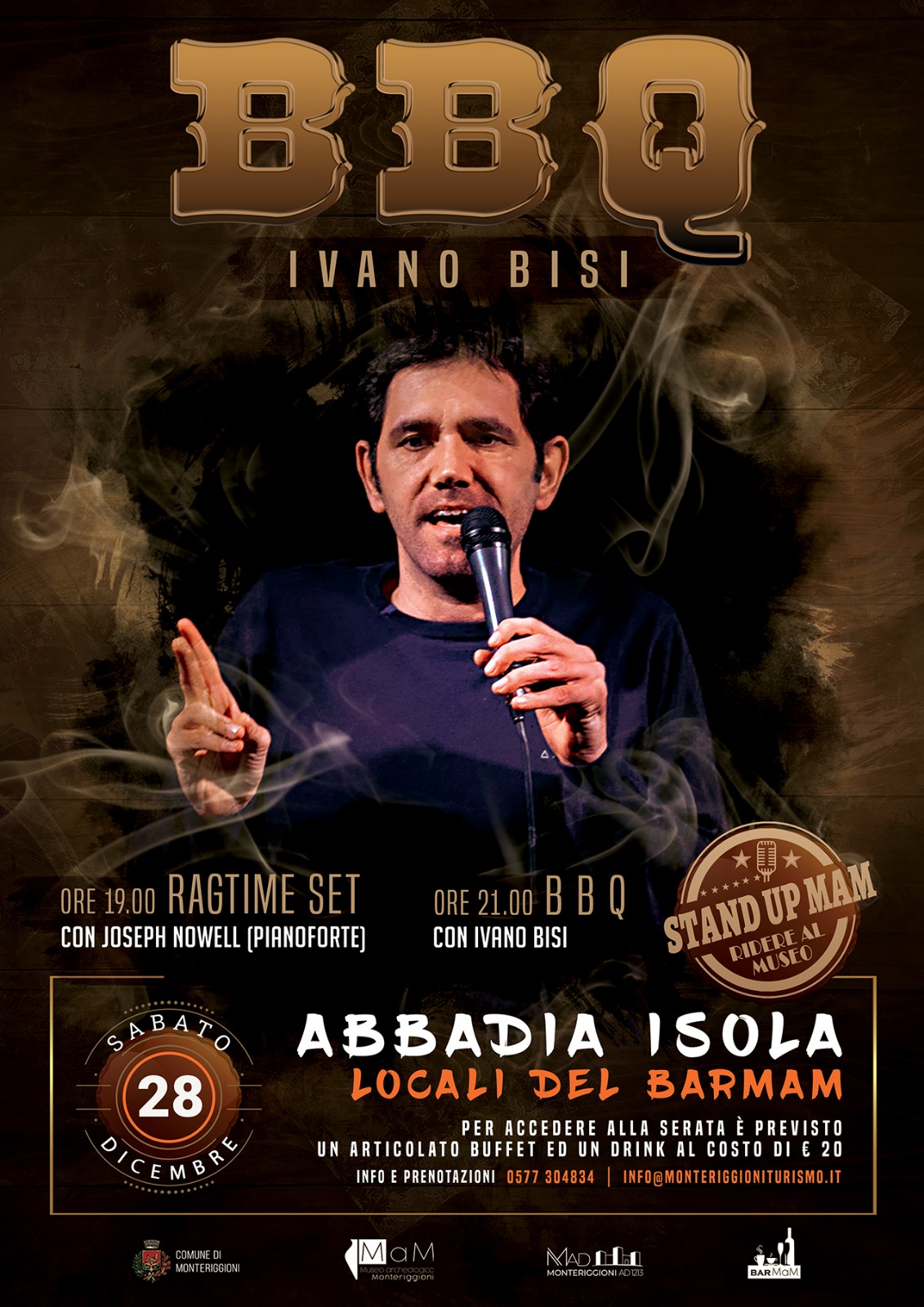 “Stand Up MaM. Ridere al Museo”, sabato 28 dicembre, Abbadia Isola - locali del BarMaM (Monteriggioni): musica di qualità con il pianista Joseph Nowell e la sferzante comicità di Ivano Bisi.