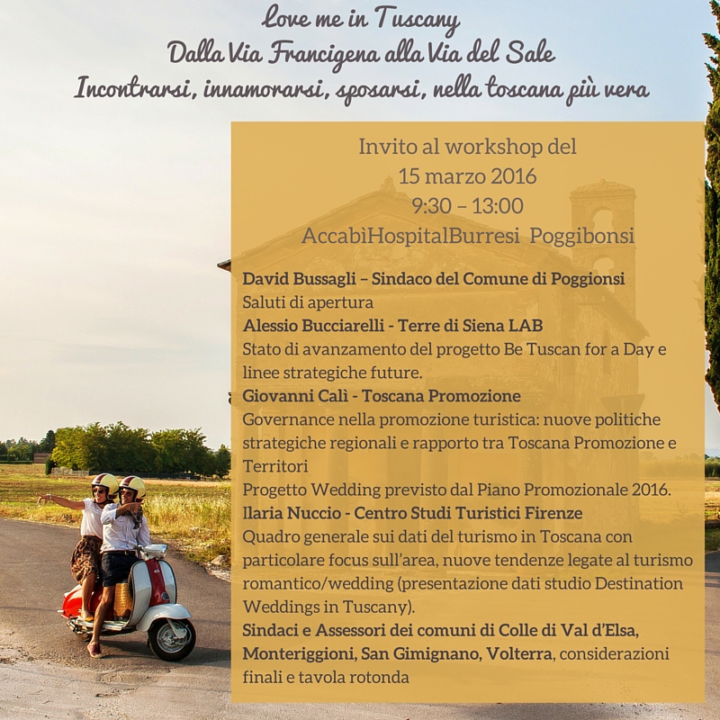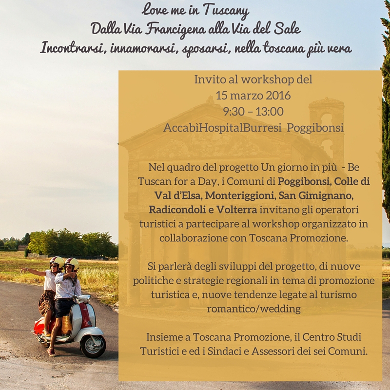 “LOVE ME IN TUSCANY. Dalla Via Francigena alla Via del Sale: incontrarsi, innamorarsi, sposarsi, nella Toscana più vera”.