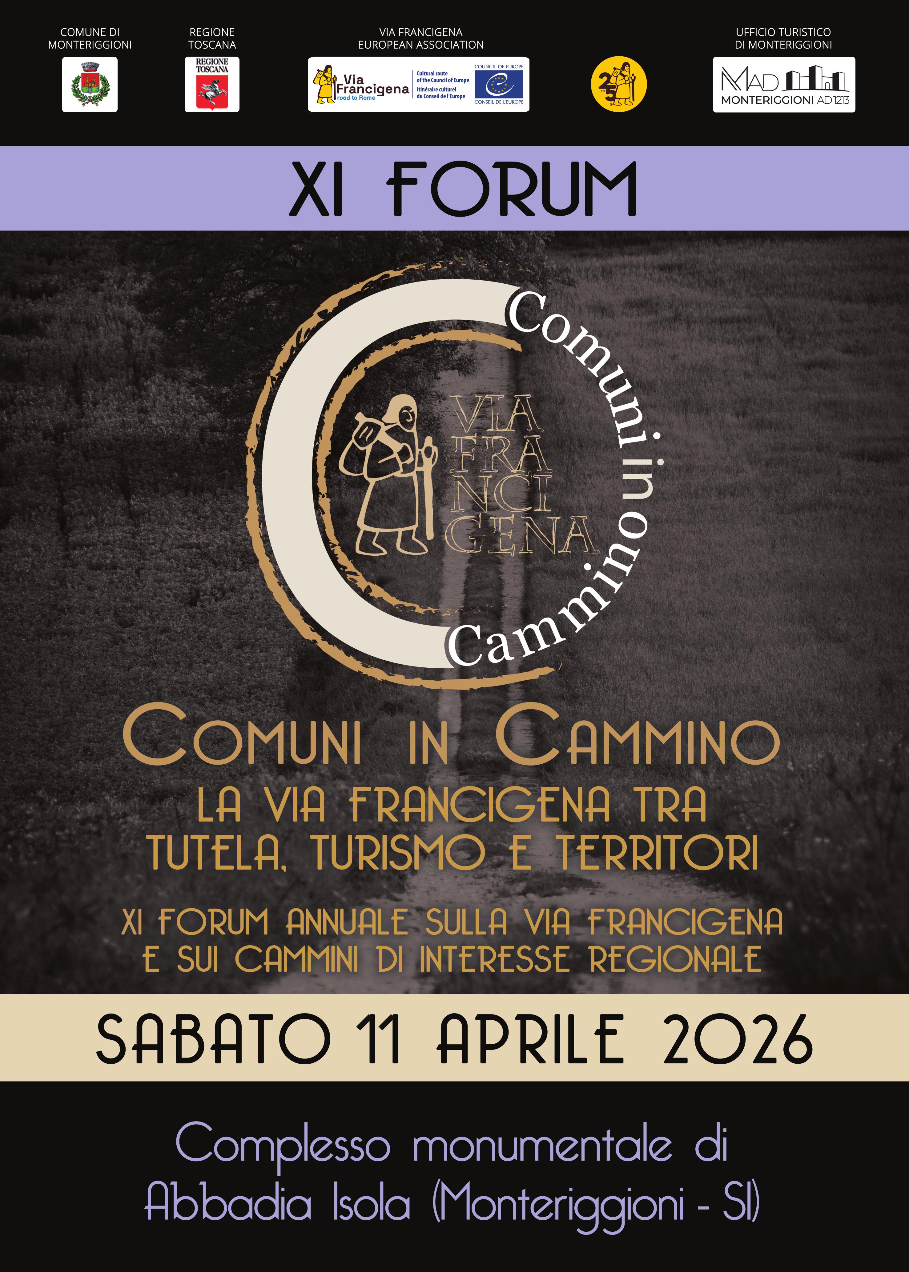 Sabato 11 Aprile 2026, alle 9:30, presso la Sala Ildebrando del Complesso monumentale di Abbadia Isola (Piazza Gino Strada 2, Monteriggioni – SI) si terrà l'XI Forum annuale sulla Via Francigena e sui Cammini di interesse regionale “Comuni in Cammino. La Francigena fra tutela, turismo e territori”.