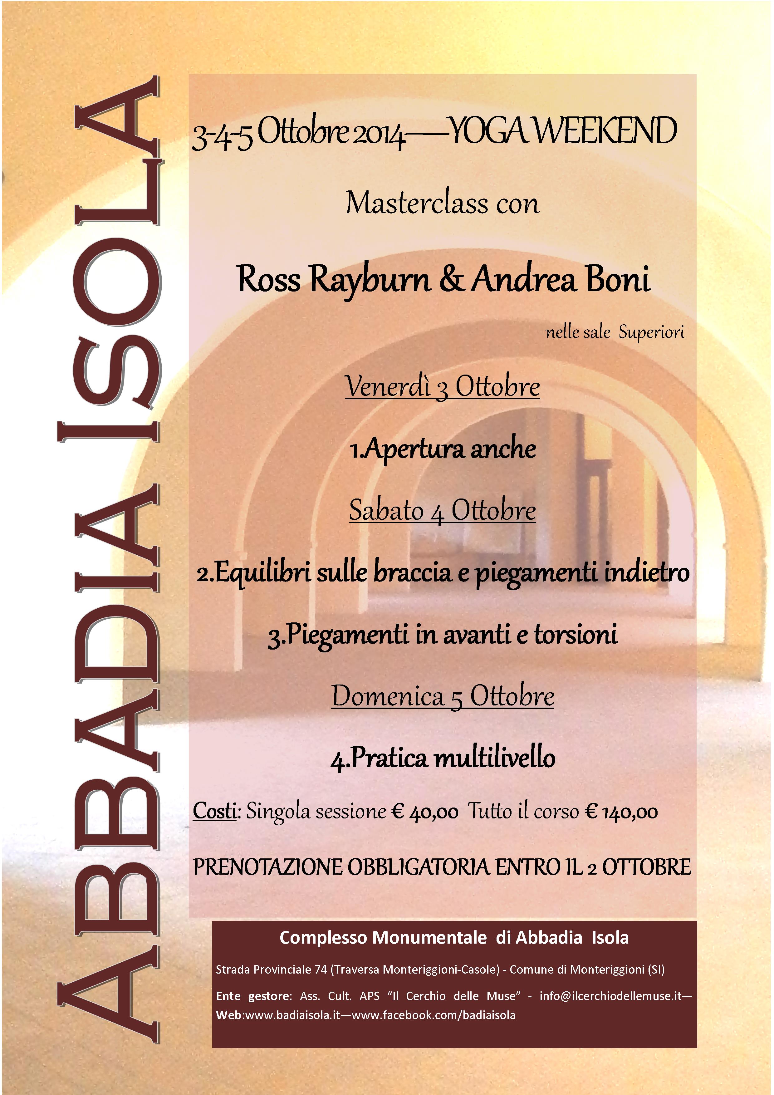Dal 3 al 5 ottobre, presso il complesso monumentale di Abbadia Isola si svolgerà "Yoga weekend", masterclass con Ross Rayburn e Andrea Boni.